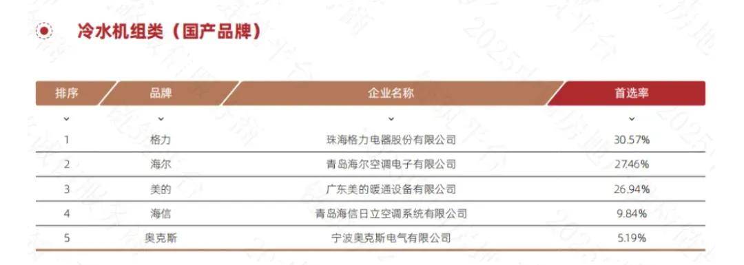 冷水机组类(邦产物牌):格力、海尔、美的、海信、奥克斯首选率上榜,首选率区别为30.57%、27.46%、26.94%、9.84%、5.19%。